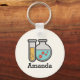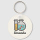 A keychain with a cute illustration of a test tube holding yellow liquid and a rounded flask/beaker holding green liquid with red bubbles.