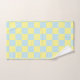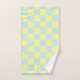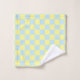 Abstract digital art of pastel blue and yellow squares in a chequered formation.