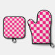 Chequered squares hot pink white geometric retro oven mitt & pot holder set