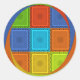 The central portion features a grid or chequerboard pattern composed of squares in red, golden yellow, green, and cyan.