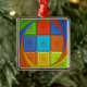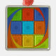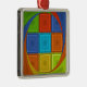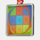 The central portion features a grid or chequerboard pattern composed of squares in red, golden yellow, green, and cyan.