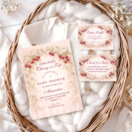 This romantic cherry garden collection features lush red cherries, soft blush florals, and flowing ribbon bows arranged in an elegant botanical frame. Inspired by vintage garden celebrations, the design blends delicate florals with rich fruit details for a timeless, storybook aesthetic. Perfect for creating a warm, charming atmosphere with a refined yet playful feel.