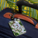 Luggage tag featuring a photo of pale pink cherry blossom flowers.