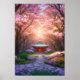 A serene and peaceful view of a small Japanese shrine nestled among beautiful cherry blossom trees. A stone path leads up to the shrine, and colourful flowers surround it, adding to the charm of the scene.