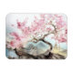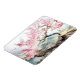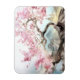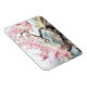 A majestic peacock alongside colourful birds, set against a serene mountain backdrop with delicate cherry blossoms in full bloom.