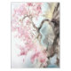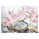 A majestic peacock alongside colourful birds, set against a serene mountain backdrop with delicate cherry blossoms in full bloom.