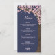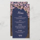 Fully customisable Menu Card or Program Card, featuring a bough of pale pink cherry blossoms on a navy night-time background. All text is fully editable. The back side features a wreath of cherry blossoms in which you can add the couple's initials, a date, or your choice of other text.