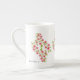 Branches of bright pink cherry blossoms all aroung a bone china mug.