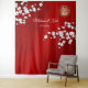 This Chinese wedding/ tea ceremony backdrop features white cherry blossoms and a gold double happiness symbol on a red background. Bride and groom names in a traditional elegant script. Matching wedding suit available.