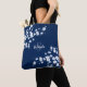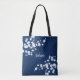 Elegant white cherry blossoms on a navy blue background. Customise this elegant floral tote bag with a name and monogram,