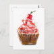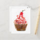 a traditional watercolor artwork of a tasty looking cupcake with a creamy topping and a cherry on a postcard.