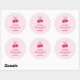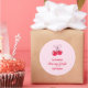 "Cherry first birthday" themed birthday favour stickers with illustrated cherries tied with a pink bow.