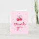 "Cherry first birthday" themed birthday thank you card with illustrated cherries tied with a pink bow, and adorable handwritten font.