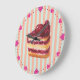Whimsical, retro inspired design features cherry layer cake slice on striped background with pink heart clock face wreath