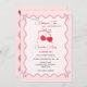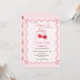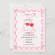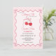 Designed with love and attention to detail, each invitation features a whimsical wavy pattern that adds a playful touch to the overall design. The combination of red cherries and pink bows creates a delightful contrast that captures the essence of fun and sweetness.