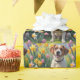 A cheerful dog sits peacefully on lush green grass, surrounded by colourful spring blooms under a soft blue sky. This digital oil painting captures a serene moment with expressive brushstrokes, warm colours, and a sense of gentle joy.