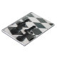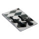 Photograph of the corner of a chess board with black pieces on home position showing.