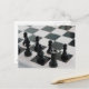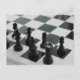 Photograph of the corner of a chess board with dark pieces on home positions showing.