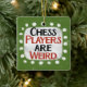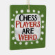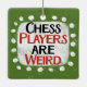 "Chess Players Are Weird" is a cute text design in green with black and red text, along with a white accent shape and white textured whimsical dots surrounding it.