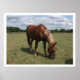 Photograph of a chestnut horse with light mane grazing in a pasture with trees and cloudy sky in the distance.