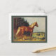Vintage colour oil painting of a chestnut coloured horse with flaxen tail and mane standing on a hill with a pine tree grove and overlooking a farm and fields landscape.