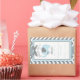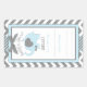 Grey and white chevron print with blue accents and 3D-look polka-dot bow with blue elephant with bow-tie and bird book plate label design.