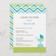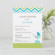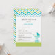 A darling customisable baby shower invitation featuring a blue and green chevron baby carriage. Matching address label, thank you card and favour sticker.