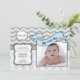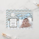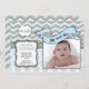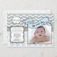 This trendy design features a blue, white and grey chevron pattern complemented by a blue, white and grey damask pattern. There is a grey crest for you to customise with your baby's name and last name along with plenty of text to introduce your new baby boy to the world at your Sip 'n See party. Upload your own baby's photo to the adorable blue banner and you are ready to order your trendy party invitations. We also have this design available in pink for girls!