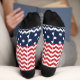 Chevron stripes of navy blue and white and red and white with navy blue with white polka dots.