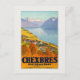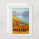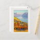 Vintage travel poster featuring a vibrant village alongside a serene lake, surrounded by lush vineyards and framed by majestic mountains. The quaint houses and a prominent church tower create a picturesque scene beneath a clear sky. Published in 1923 in Switzerland.