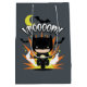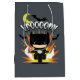 This playful graphic features a chibi-style Batman riding his motorcycle under a crescent moon, surrounded by flying bats. The design captures the whimsical side of Gotham's dark hero in a fun and kid-friendly format. With bold "VROOOOM!" text mimicking the roaring sound of the Batcycle's engine and vibrant explosion effects in the background, the artwork is dynamic and full of energy. The cartoonish depiction of Batman, complete with his iconic costume and stoic expression, adds a charming twist to the legendary character. This graphic is perfect for younger fans of Batman, offering a lighthearted take on the usually intense superhero adventures.