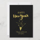 Elegant black New Year card featuring “Happy New Year” written in shining gold lettering. Below the text sits a golden holiday hat bursting with festive golden elements, creating a joyful and celebratory look. The design feels luxurious, modern, and perfect for seasonal greetings and New Year celebrations.