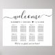 Chic wedding seating chart poster for up to 8 tables that features "welcome" in an elegant script with swashes, your names and wedding date joined together by a heart and "We're so glad you're here" in classic serif typography. Select the digital download option to edit with last minute changes and print locally.