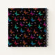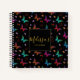 A custom notebook with an elegant pattern with a graphic illustration of fluttering butterflies in many bright colours, contrasting very nicely on the black background. Whimsical florals, sprigs and leaves add a bit of charm. A black frame with a gold coloured border layered over top with your personalised text inside.