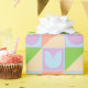 The artwork is of pastel blue and blush pink tulip flowers presented in an elegant colourful geometric design of mustard yellow, baby blue, spring green, and orange squares and triangles. The colourful, floral design is cute and elegant for that delicate flower lover in your life!