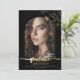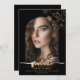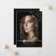 Modern black and gold themed graduation announcement card, featuring an arched photo, chic gold stencil foliage and a flower. The card comes with a template text which is easily edited, the font styles can be changed by clicking on the customize further link after personalizing.