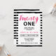Invite friends and family with this chic black and white stripes 21st birthday invitation featuring the word "Twenty" in pretty pink watercolor.