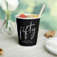 Fun 50th birthday party decor black paper cups that feature "fifty" showcased in a chic modern white script.