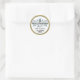 Chic and elegant holiday Merry Christmas classic round sticker with a gold glitter sparkles border and white background. The words "Merry Christmas" are written in a bold black script. The sticker is decorated with a swirly, fancy grey design featuring a Christmas tree, two reindeer and baubles. At the bottom of the sticker are the words "with love from" in grey, and your family name surname in black.