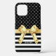 Stylish iPhone case, with a black and white polka dot pattern, on the top of the case and a black and white striped background, on the bottom. Graphics of a pretty gold tone ribbon and bow runs across the case between the two backgrounds. White custom text, on the bottom half, is ready to personalise. Pretty way to protect your device and look stylish too, and makes a great personalised gift idea. Chose from matte or glossy finish on this great looking case.
