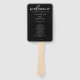 These chic custom black wedding program hand fans feature elegant personalised white typography and a minimalist layout for your winter evening ceremony. Add your bridal party details on the back.
