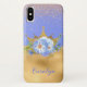Chic iPhone case, with graphics of a periwinkle blue and gold foil background, with faux glitter and gorgeous graphics of a gold crown with cornflower blue and periwinkle blue flowers. Personalise the text to suit your needs.