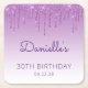These chic 30th birthday party paper coasters feature a sparkly purple faux glitter drip border and purple ombre background. Personalise them with the guest of honour's name in purple handwriting script, with her birthday and date below in sans serif font.