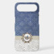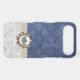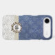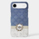 Elegant iPhone 6 case, done in a vintage winter white and grayish damask pattern, on the bottom, and a blue vintage damask pattern, on the top. Graphics of a ivory ribbon runs between the two backgrounds. Digital graphics of a pearl decoration, on the ribbon, has a blue one letter monogram. Personalise the letter for yourself or as a lovely gift idea.