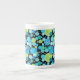 A chic Bone China Coffee Mug, with a quirky 'Blue Moons' pattern in bright blues and neon green on a black background. Part of the Posh & Painterly 'Blue Moons' collection; from a handpainted paper collage design by Judy Adamson.