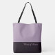 This lovely fashion forward tote bag shows the word "Maid of Honour" in white text colour over the deepest dark smoky purple-amethyst with the upper tote bag in custom Sugared Plum. Has plenty of room for personalised text. Graphics and text are on both sides of this tote bag. Black handle. Customise further or buy as shown.