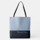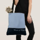 This lovely fashion forward tote bag shows the word "Maid of Honour" in white text colour over the deepest dark Midnight Blue with the upper tote bag in custom Antique Blue with Rainy Day blue text. Has plenty of room for personalised text. Graphics and text are on both sides of this tote bag. Black handle. Customise further or buy as shown.