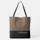 This lovely fashion forward tote bag shows the word "Bridesmaid" in white text colour over black with the upper tote bag in custom Latte Brown. Has plenty of room for personalised text. Graphics and text are on both sides of this tote bag. Black handle. Customise further or buy as shown.