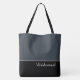 This lovely fashion forward tote bag shows the word "Bridesmaid" in white text colour over black with the upper tote bag in custom Steel. Has plenty of room for personalised text. Graphics and text are on both sides of this tote bag. Black handle. Customise further or buy as shown.