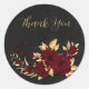 Chic and elegant thank you sticker featuring beautiful burgundy flowers and some elegant gold leaves on black background.